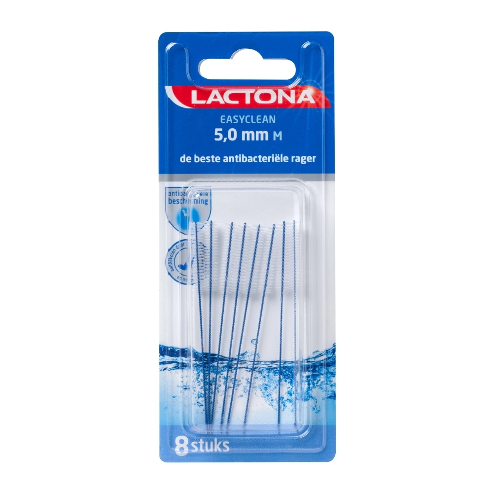 De Lactona Easyclean M 5,0 mm is speciaal ontworpen voor het grondig reinigen van grotere tussenruimtes tussen tanden en kiezen, bijvoorbeeld rondom bruggen, implantaten of orthodontische constructies. Met een diameter van 5,0 mm biedt deze rager de nodige ruimte en efficiëntie om moeilijk bereikbare plekken optimaal te reinigen. De borstelharen zijn antibacterieel behandeld voor een schonere reiniging en de extra lange steel maakt het mogelijk om ook achterste kiezen eenvoudig te bereiken. Verpakt per 8 stuks, geschikt voor zowel professioneel gebruik als thuisgebruik voor wie een complete mondverzorging nastreeft.