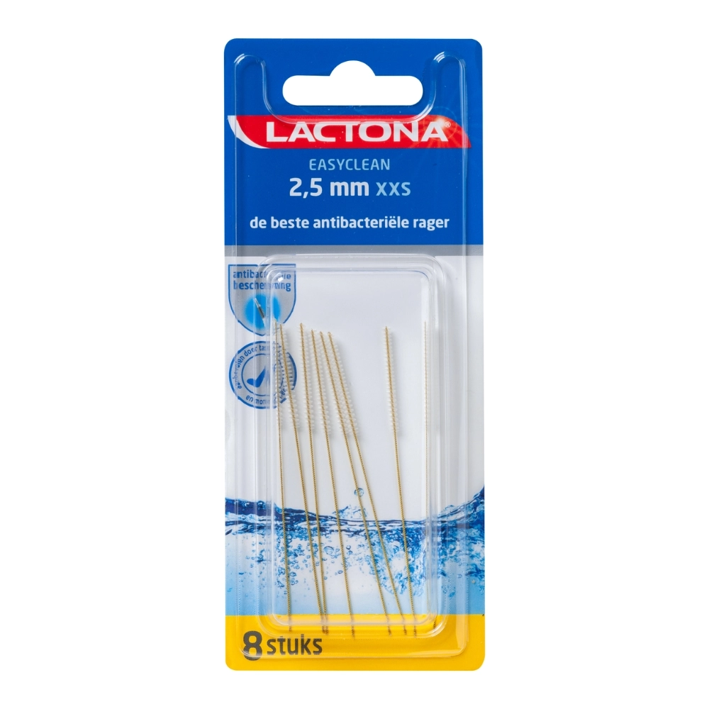Met de Lactona Easyclean XXS 2,5 mm rager kies je voor een effectieve en comfortabele oplossing voor de reiniging van harde bereikbare mondzones: smalle ruimtes tussen tanden, onder bruggen of rondom implantaten. De rager heeft een extra lange steel voor optimaal bereik en is voorzien van antibacteriële nylon haren waardoor je een betere mondhygiëne ondersteunt. De diameter van 2,5 mm maakt deze uitvoering ideaal voor kleinere tot middelmatige tussenruimtes. Verpakt per 8 stuks, geschikt voor zowel thuisgebruik als professioneel gebruik in mond- en tandverzorging.