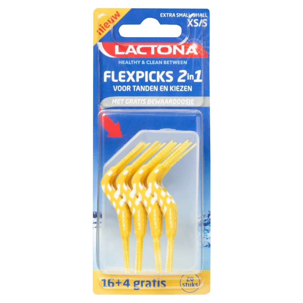 De Lactona FlexPicks 2-in-1 XS/S zijn ontwikkeld voor effectieve reiniging van de smalle ruimtes tussen tanden en kiezen. De stoker heeft een rechte zijde voor gebruik tussen de tanden en een gebogen zijde voor toegang tot de kiezen en verder naar achter gelegen zones.
