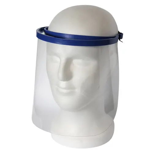 Herbruikbaar gezichtsscherm met transparant PETG-vizier, blauw PP-frame en zwarte elastische band. Biedt spatbescherming in zorg- en hygiëneomgevingen. Autoclaveerbaar tot 134°C en eenvoudig te desinfecteren.