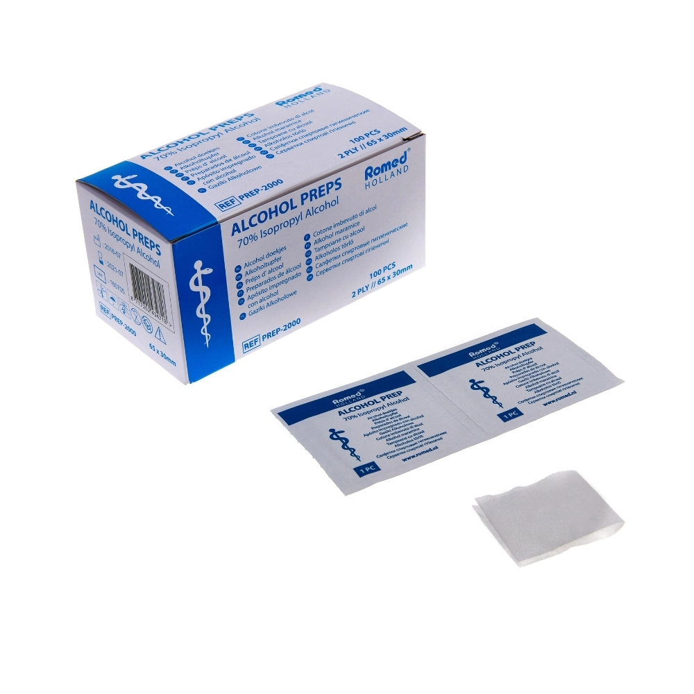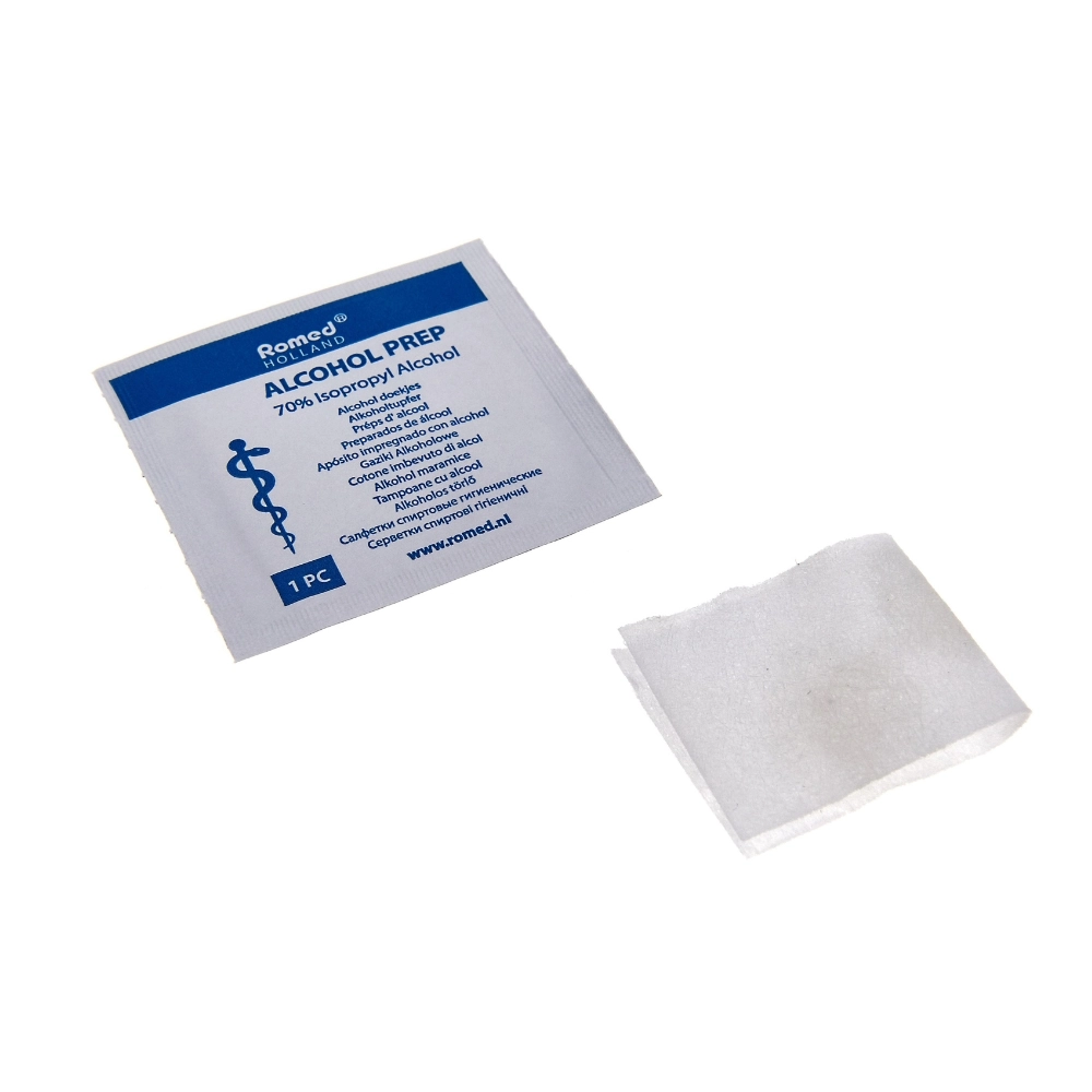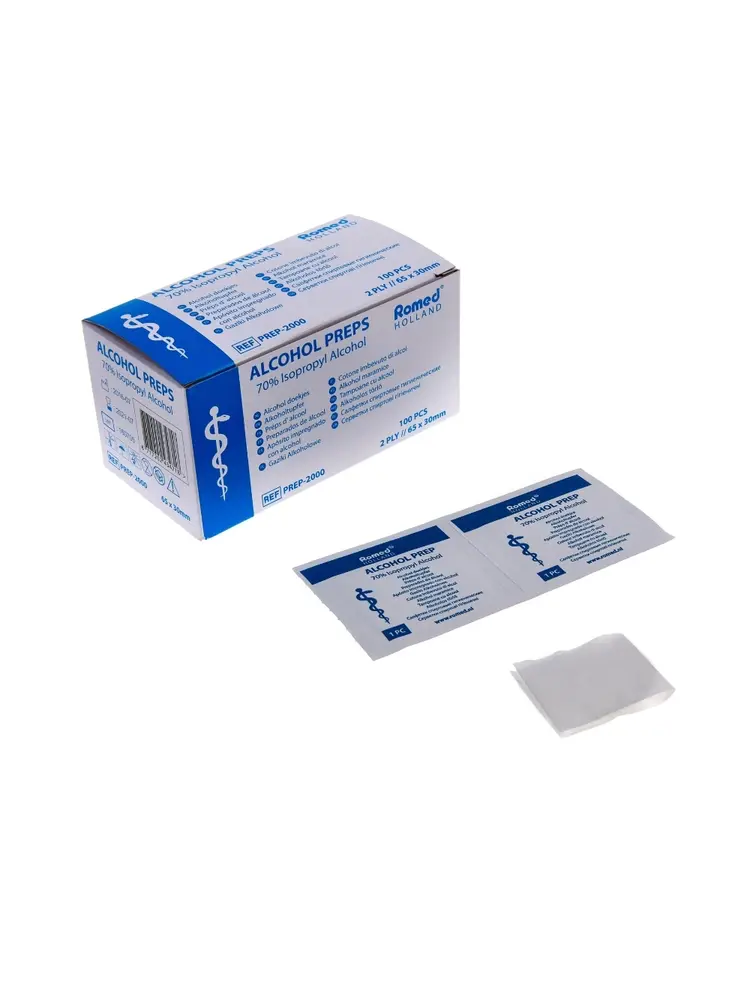 De Romed Alcoholdoekjes worden geleverd in een verpakking van 100 geëënte doekjes, elk individueel verpakt voor maximale hygiene. Met 70% isopropyl-alcohol bieden ze effectieve reiniging van huid en kleine oppervlakken — perfect voor gebruik in medische, verzorgende of huishoudelijke contexten. Dankzij het formaat (ongeveer 65×30 mm) zijn ze draagbaar en gemakkelijk in te zetten bij inspectie, wondverzorging of algemene ontsmetting van instrumenten of handen. Na gebruik éénmalig, weggooien — zo voldoe je aan hygiëne-eisen zonder extra handelingen.