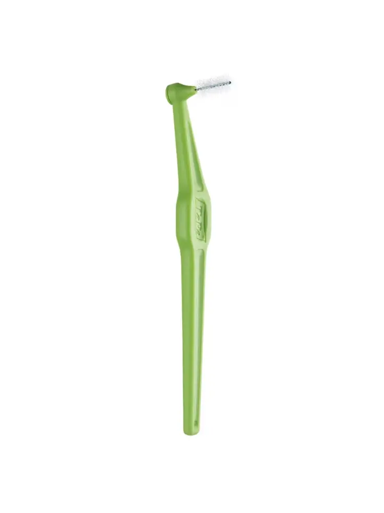 TePe Angle™ Groen (ISO 5) is speciaal ontwikkeld voor de reiniging van bredere interdentale ruimtes. Dankzij de hoekvormige borstelkop en de lange, platte handgreep bereik je moeiteloos achterste kiezen en moeilijk toegankelijke plekken in de mond.