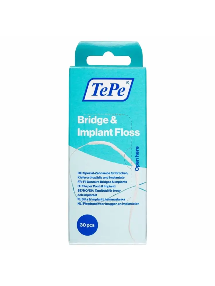 TePe Bridge & Implant Floss is ontwikkeld voor de dagelijkse reiniging van gebieden waar gewone floss moeilijk toegang heeft — zoals rondom implantaten, bruggen, beugels en grotere interdentale ruimtes. De floss bestaat uit een flexibel, sponsachtig middenstuk dat zich vormt rond protheses en tandtechnische voorzieningen om voedselresten en plak te verwijderen.