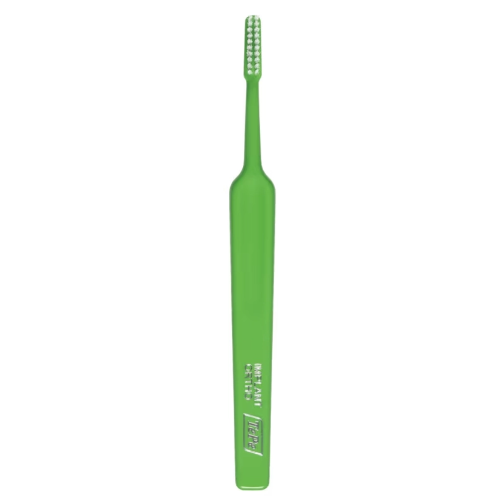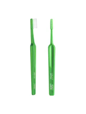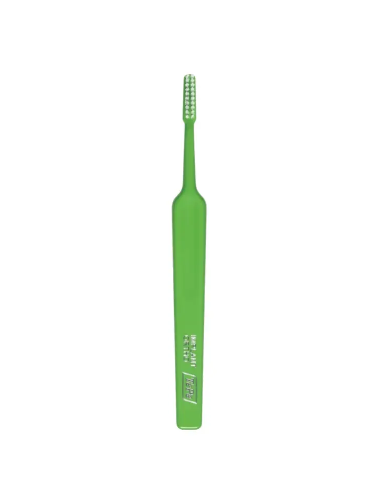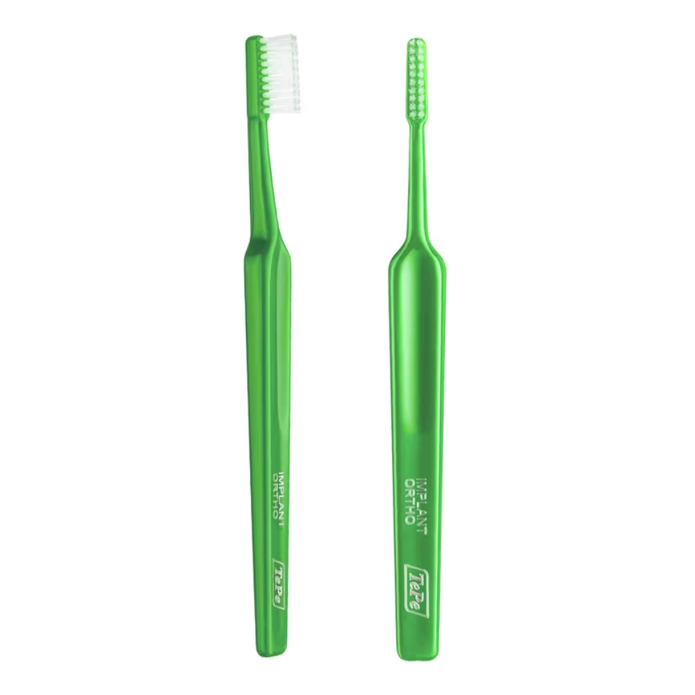 De TePe Implantaat / Orthodontieborstel is speciaal ontworpen voor nauwkeurige reiniging op plekken waar een gewone borstel niet bij komt. Dankzij de extra smalle borstelkop, zachte filamenten in twee rijen, een lange, dunne hals én een buigbare nek kan hij eenvoudig langs implantaten, over beugeldraden en de tandvleesrand reinigen zonder schade.