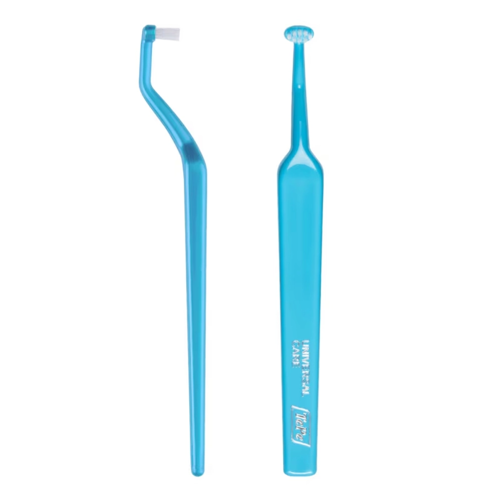 De TePe Universal Care™ is ontworpen met een unieke gebogen hals en een slanke borstelkop, waardoor de linguale en palatinale vlakken van tanden en implantaten eenvoudig bereikbaar zijn. De borstel maakt het reinigen van smalle en moeilijk bereikbare plekken mogelijk.