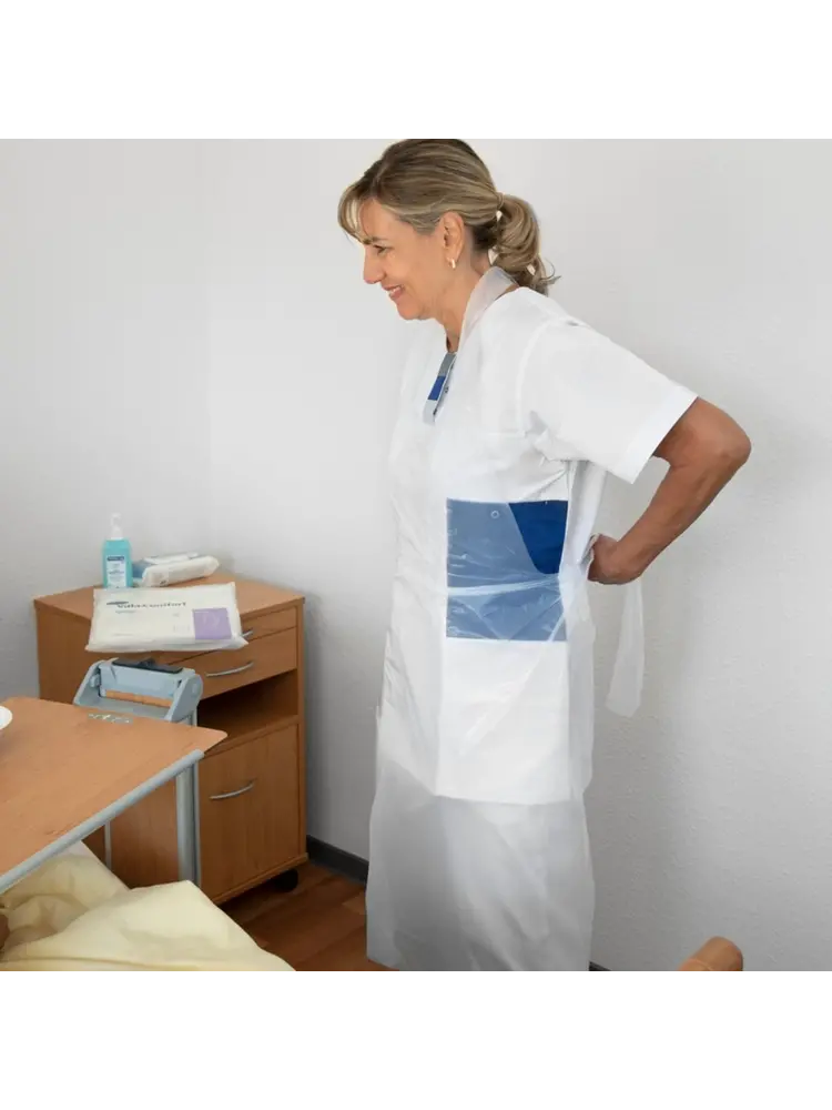 Deze schorten zijn ontworpen voor eenmalig gebruik en bieden een hygiënische, comfortabele bescherming in diverse zorgcontexten. Het materiaal is vloeistofdicht en de halsuitsnijding is afgerond voor een veilige en comfortabele pasvorm. De schort wordt aan de achterkant vastgebonden met banden voor optimale afsluiting. Eén verpakking bevat 100 stuks, afzonderlijk gevouwen voor praktische inzet in drukke zorgomgevingen.